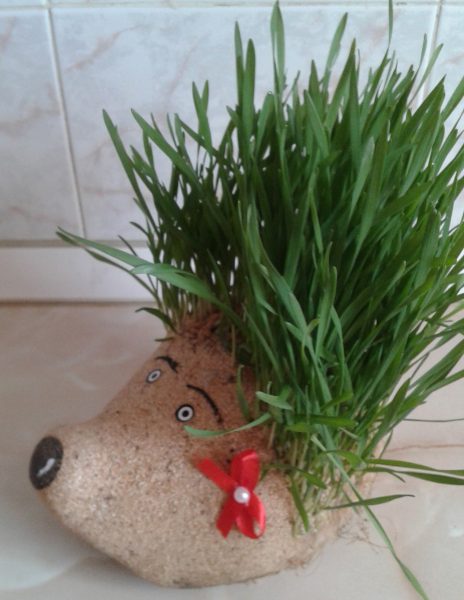Nekoliko dana (2 do 3) je potrebno leđa ježa držati u vodi na toj strani gde se nalazi pšenica, da bi se piljevina dobro natopila i da bi pšenica proklijala. Pazite da ježu ne pokvasite ostale delove tela. Kada krene da klija, jednostavno samo održavajte vlažnost žita i pšenica će biti predivna! Na kraju, ježu dodajte oči i nos od dugmića ili gline.