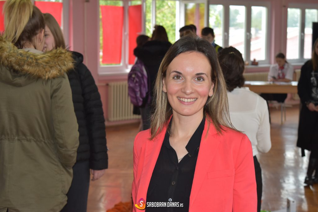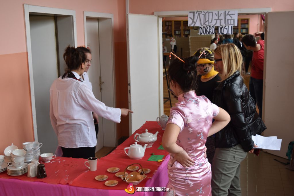 “U okviru dana posvećenih prirodnim naukama, na red je došla geografija, i danas smo posvećeni Kini. Moram reći, ideja je moja, i ja sam učenicima podelila zaduženja, ali oni su bili toliko inspirativni i zapravo su najveći deo svega ovoga oni uradili. Moram da im se zahvalim, jer su bili mnogo bolji od onoga što sam mogla da očekujem, pa i da sama uradim. Kinu na učeničkim štandovima danas možemo da omirišemo, vidimo i probamo. Na samom ulazu nas dočekuje ‘Kineskinja’ koja nas pozdravlja sa ‘mihao’, korak dalje nailazimo na dve devojčice koje pripremaju tradicionalne kineske čajeve, a zatim ulazimo u veliku prostoriju u kojoj su sa obe strane predstavljeni kulturno-istorijski spomenici i razvitak Kine. Jedan poseban odeljak predstavlja ptice i floru Kine, koja je zaista poznata po velikom broju raznovrsnih ptica, zatim odeljak za pande, koje su zaštićena vrsta i koje su simbol WWF-a, Svetske organizacije za očuvanje prirode”.