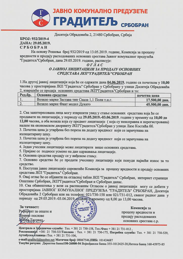 Komisija za procenu vrednosti i prodaju rashodovanih osnovnih srestava Javnog komunalnog preduzeća ”Graditelj” Srbobran, raspisala je “Oglas o drugoj javnoj licitaciji za prodaju osnovnih sredstava JKP Graditelj Srbobran”, odnosno dva rashodovana vozila.