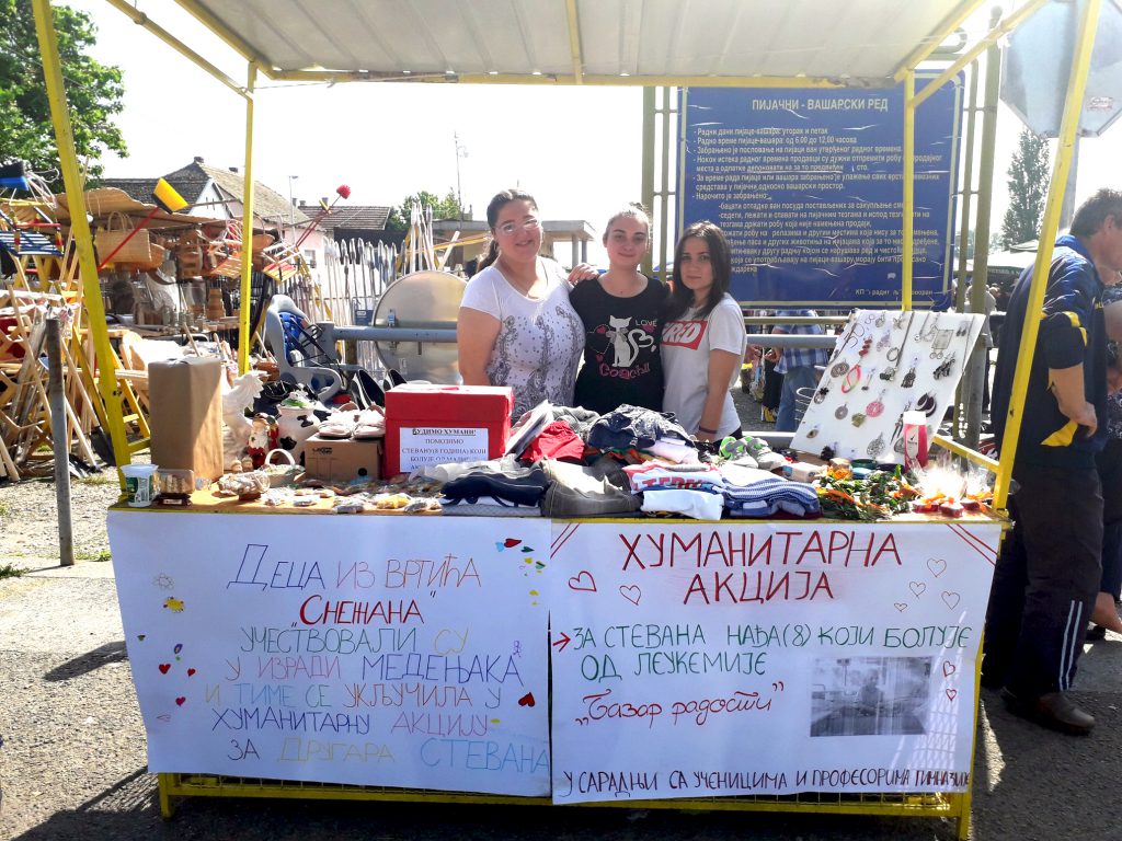 “Cilj ove akcije, kojoj su se priključila naša deca, je da se sakupi novčani prilog za našeg druga Stevana, koji boluje od leukemije. Prodajom medenjaka sakupili smo 7.000 dinara, koje ćemo uplatiti na žiro racun, na kraju školske godine, zajedno sa novčanim prilogom koji smo sakupili po svim našim objektima. Zahvaljujemo se učenicima iz Gimnazije koji su nam pomogli u prodaji naših medenjaka na pijaci”, reči su koje upućuju vaspitačice vrtića “Snežana”.