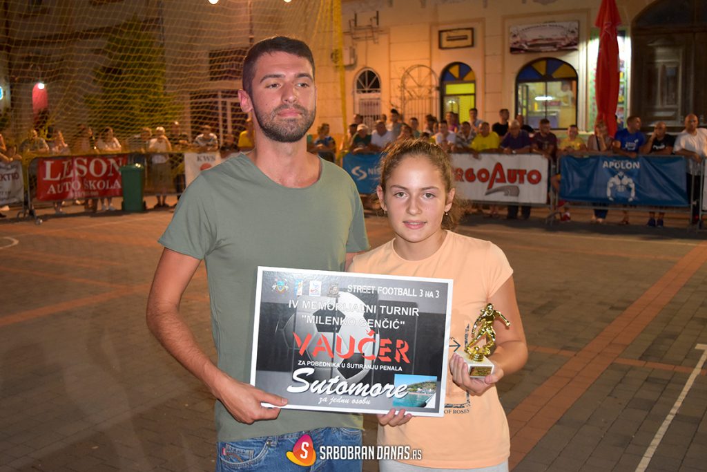 Pre nego što su na teren izašli seniori, održano je finale u izvođenju penala, u kom su blistale dame. Nakon više serija šutanja na gol, sa različitih udaljenosti, najbolja je bila Anja Kovačev, istakmuta atletičarka Srbobranskog atletskog kluba. Ona je kao nagradu dobila letovanje u Sutomoru u trajanju od 10 dana, nagradu koju poklanja opština Srbobran, a vaučer joj je uručio direktor odmarališta Reljić Miroslav.