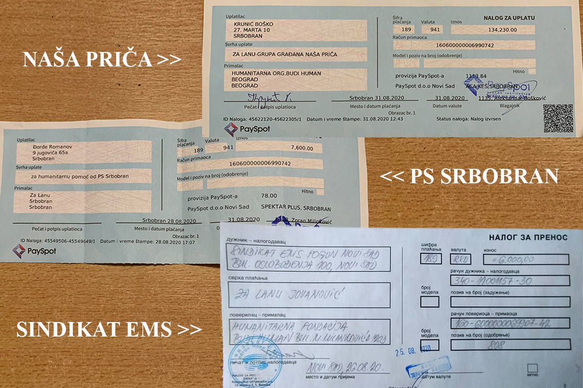 Novac je skupljan i klasičmo u kutiju za dobrovoljne priloge, ali je prodavano i piće, kuvani kukuruz, a “Turinac” Ivan Jocić došao je u Srbobran sa svojim fijakerom i dva ata, sa kojima je vozio posetioce turnira po prisutupačnoj ceni i takođe sve dao u kasu za Lanu. Nisu izostali ni veći pojedinačni prilozi: humanitarac Žića Maradona poslao je iz inostranstva 250 evra, Predrag Brkić 100 evra, policajci iz stanice Srbobran su sakupili 7.600 dinara i uplatili na račun, a isto je uradio i Sindikat EMS Novi Sad sa 6.000 dinara… “Naša priča” je uplatila deo koji je bio kod njih u visini od 134.230 dinara, što je ukupno za tri dana turnira izašlo na 179.830 dinara.