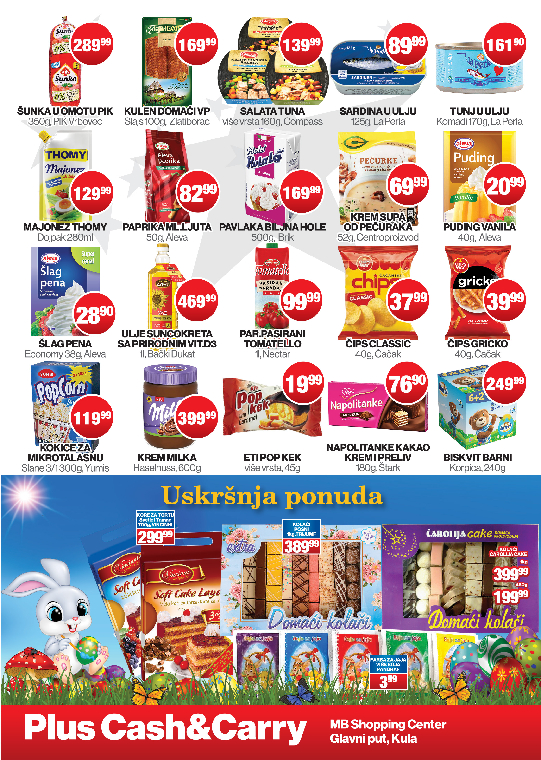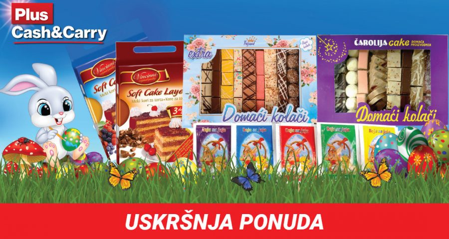 Plus Cash&Carry u Kuli pripremio je sjajnu uskršnju ponudu! Po ceni od samo 299,99 dinara možete da kupite Vincinni kore za tortu. Ukoliko nemate vremena da sami pravite kolače, Plus Cash&Carry ima odličnu ponudu posnih i mrsnih gotovih sitnih kolača. Kilogram posnih Trijumf kolača platićete 389,99 dinara, dok Čarolija Cake ima u ponudi kolače od kilogram po ceni od 399,99 ili od 450 grama za 199,99 dinara. Tu su i nezaobilazne boje za jaja po ceni od 3,99 dinara po kesici.
