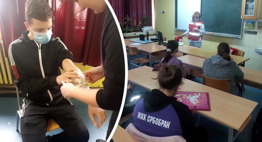 Jedna takva akcija sprovedena je juče u Osnovnoj školi “Jovan Jovanović Zmaj”, gde su učenicima sedmog i osmog razreda priređene pokazne vežbe. Decu je tema zanimala i rado su učestvovala u vežbi, naučili su kako se zaustavlja krvarenje upotrebom kompresionog zavoja, prvog zavoja, kao i sa trouglastom maramom, a uspešno su jedni drugima radili mobilizaciju ruke, kao što se čini u slučajevima teških povreda.