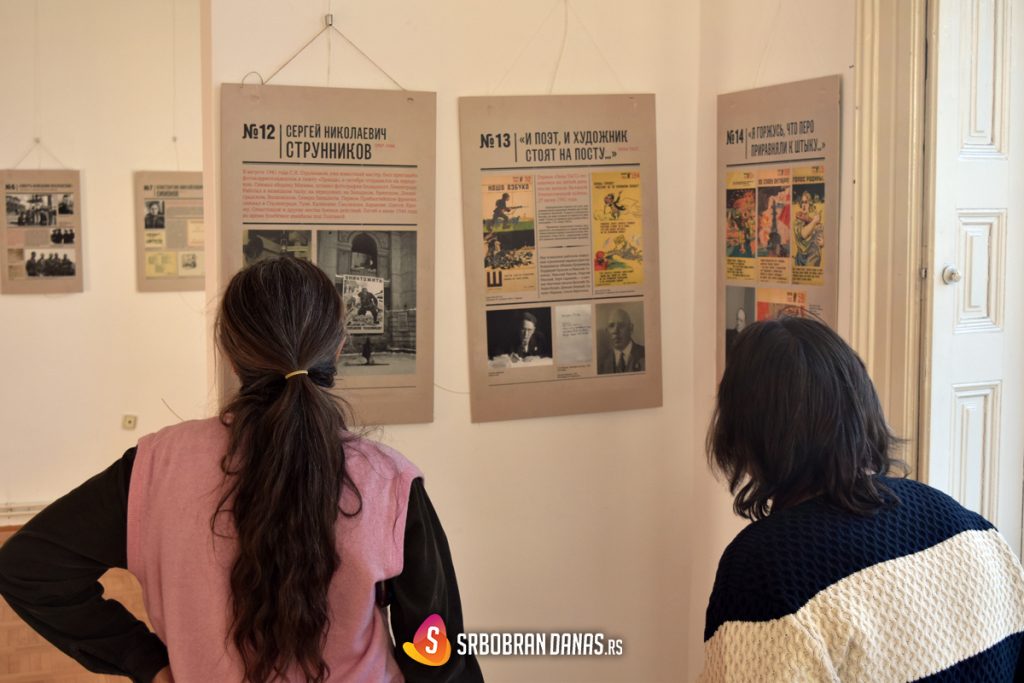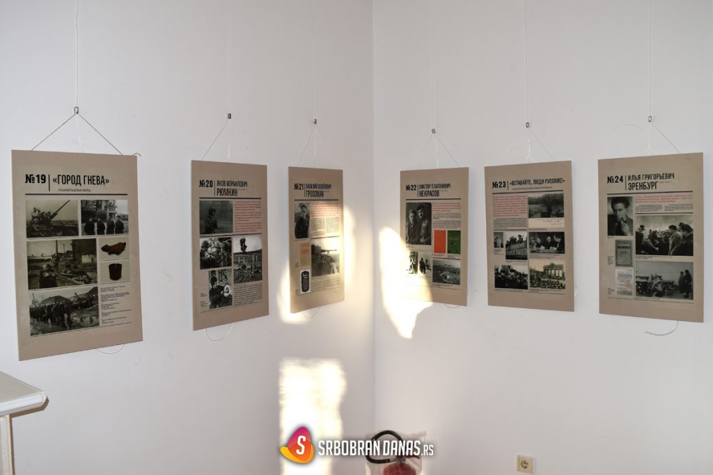 “Ovu izuzetnu izložbu kod nas je dovelo Udruženje ‘Hrabri borci’ iz Srbobrana, tako se starajući da domaća publika pogleda fotografije koje govore u učešću najpoznatijih sovjetskih i ruskih književnika u odbrani od fašizma. Gost izložbe je Petar Kočić, koordinator antifašističke manifestacije ‘Besmrtni puk’ iz Novog Sada, koji će o izloženim panoima i samoj temi reći nešto više”, ustupajući reč gostu, kazala je direktorica Doma kulture Sonja Stojnović.