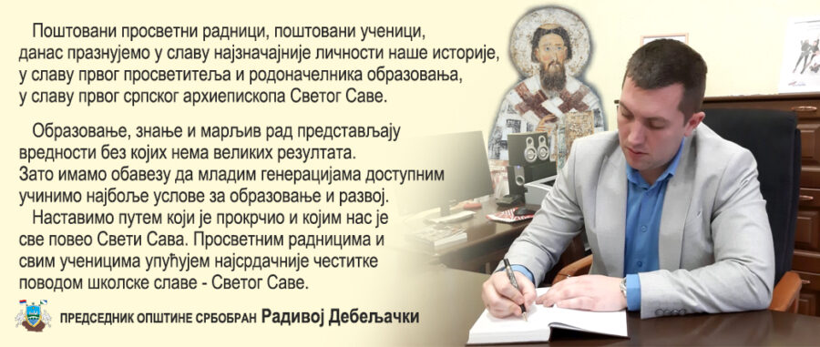 Svim prosvetnim radnicima i učenicima najsrdačnije čestitam školsku slavu – Svetog Savu”, kaže se u čestitki koju potpisuje Radivoj Debeljački, predsednik Opštine Srbobran.