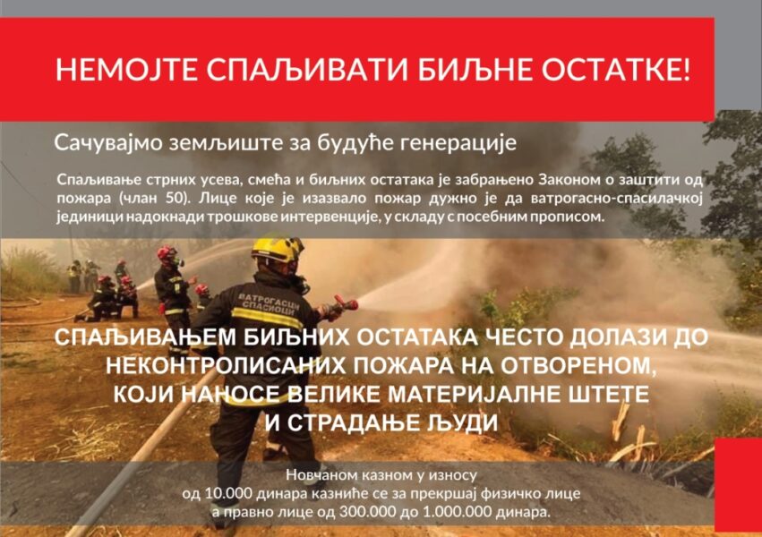 “Zakonom o zaštiti od požara (član 50.) zabranjeno je spaljivanje ostataka strnih useva, spaljivanje smeća na otvorenom prostoru i spaljivanje biljnih ostataka i za to je zaprećena kazna za pravna lica od 300.000 do 1.000.000.000 dinara, a za fizička lica 10.000 dinara. Takođe, članom 46. istog zakona zabranjeno je loženje vatre u šumi i na udaljenosti od 200 metara od ruba šume, izuzev na određenim i za to obeleženim mestima, u skladu sa propisanim merama zaštite od požara. Za nepoštovanje ove odredbe zakona zaprećena je kazna za fizička lica od 10.000 do 50.000 dinara”, saopštio je Štab za vanredne situacije.