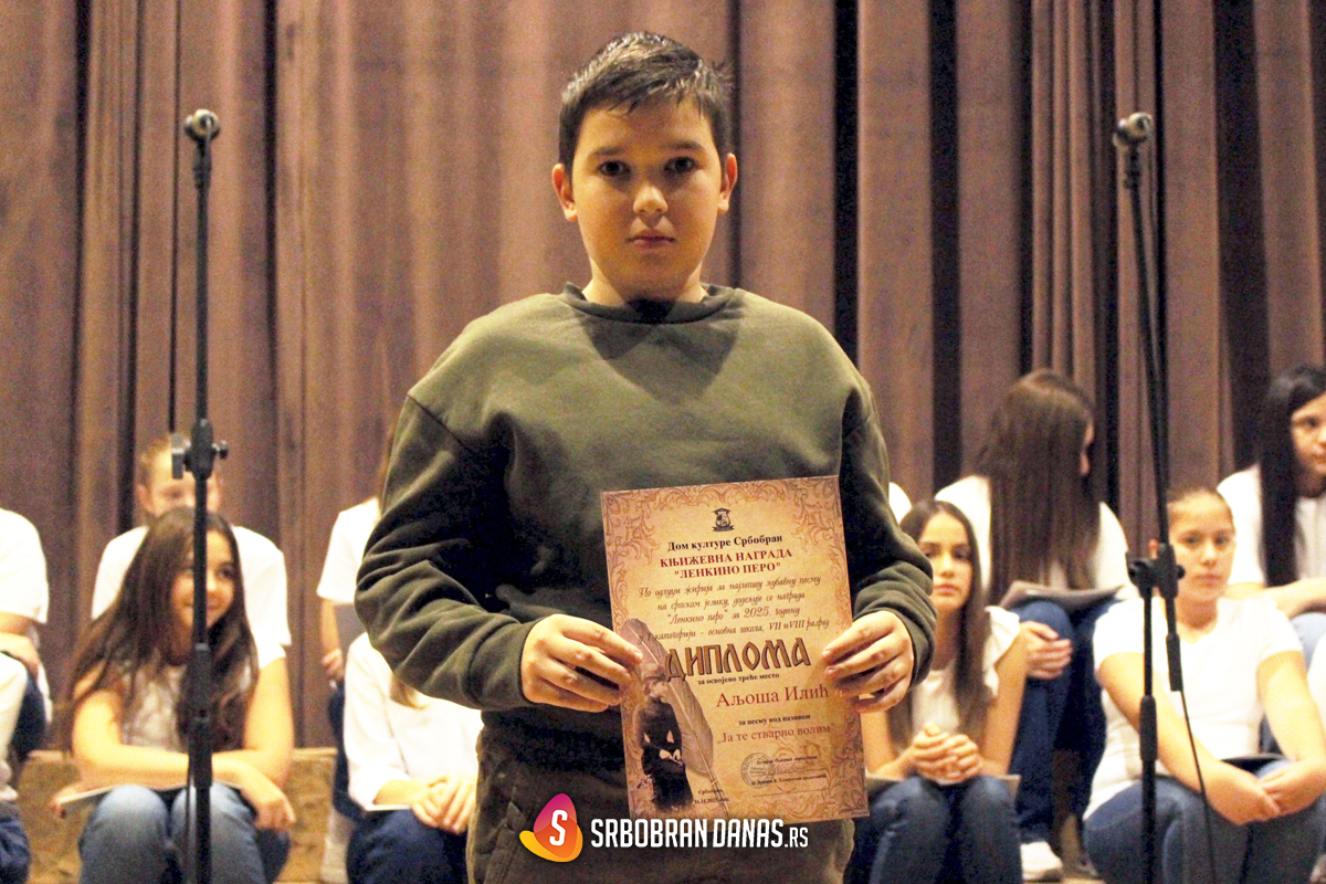 Zatim je usledila svečana dodela nagrade “Lenkino pero” za 2025. godinu. Direktorka Doma kulture Srbobran, Julkica Popović uručila je plaketu i diplomu Naomi Javor, učenici VII razreda Osnovne škole “Jovan Jovanović Zmaj ” iz Srbobrana, za prvo mesto koje joj je donela pesma “Nepoznata ljubav”.