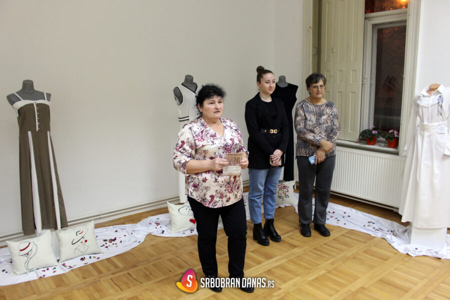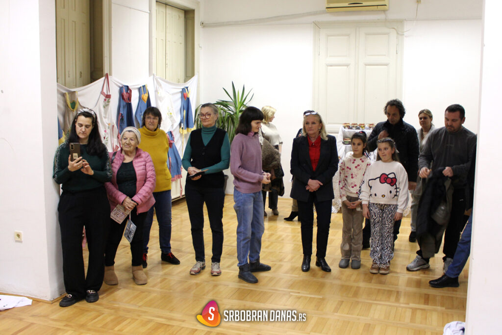 Predsednica Udruženja “Ruka spasa”, Savka Lazić, otvorila je izložbu ETNO REVIVAL i predstavila eksponate, od unikatnih haljina, košulja i kecelja, preko kapa i jastuka, do ručno ukrašenih kolača, medanjaka i drugih đakonija koje su nekad bile prepoznatljivi i sastavni deo srpske trpeze.