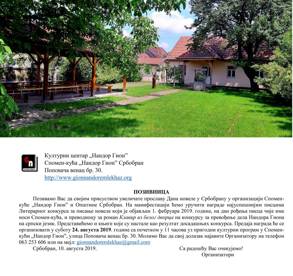 Kulturni centar „Nandor Gion” Srbobran, poziva sugrađane da svojim prisustvom uveličaju proslavu Dana novele koja će biti upriličena u Spomen-kući „Nandor Gion” uz podtšku Opštine Srbobran.