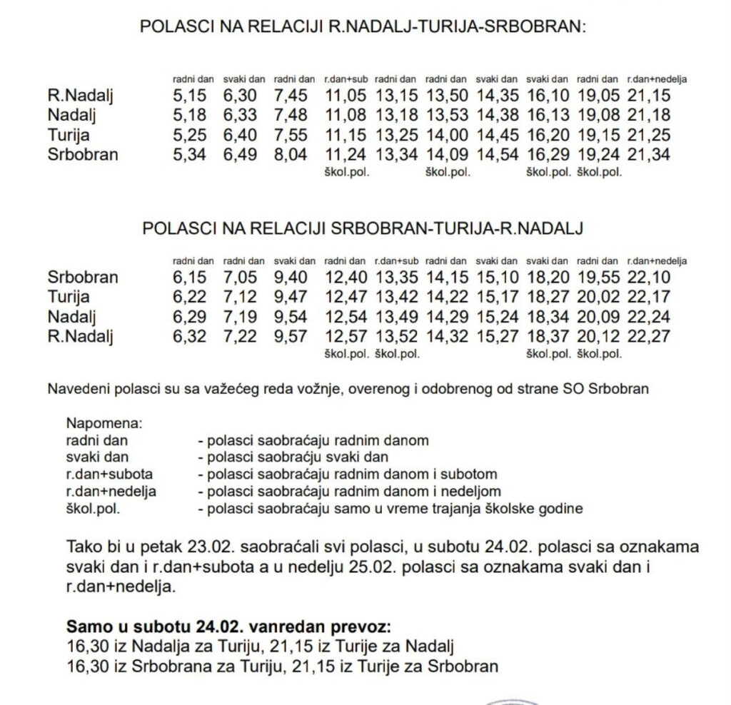 Red vožnje autoprevoznika Bečejprevoz na relaciji Srbobran-Turija-Nadalj i obratno, uz dodatne polaske tokom manifestacije “Kobasicijada” u Turiji, od 23. do 25. februara 2024. godine.