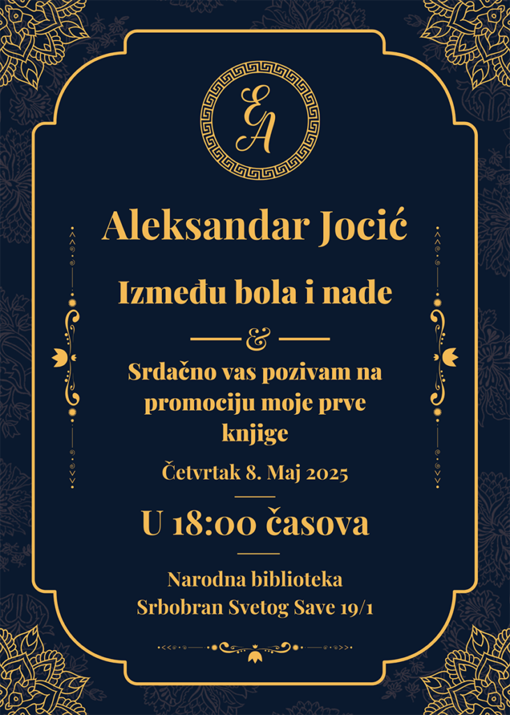 Knjiga autora Aleksandra Jocića – Između bola i nade, biće predstavljena lokalnoj čitalačkoj publici u Narodnoj biblioteci Srbobran u četvrtak, 8. maja 2024, s početkom u 18.00 časova.