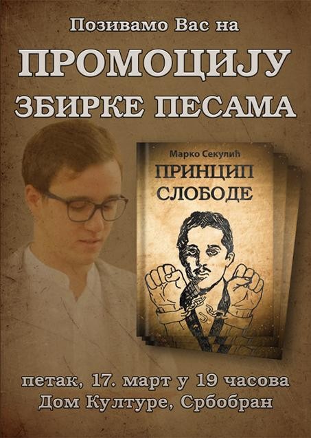 Rodoljubiva poezija Marka Sekulića dobiće svoju adekvatnu promociju u petak 17. marta. Zbirka pesama „Princip slobode“ biće predstavljena publici u Galeriji Doma kulture od 19. časova.
