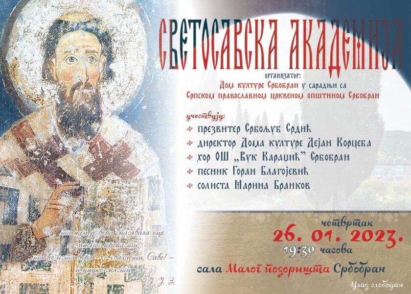 Dom kulture Srbobran, u saradnji sa Srpskom pravoslavnom crkvenom opštinom Srbobran, organizuje Svetosavsku akademiju u četvrtak, 26. januara, u 19.30 časova, u sali Malog pozorišta.