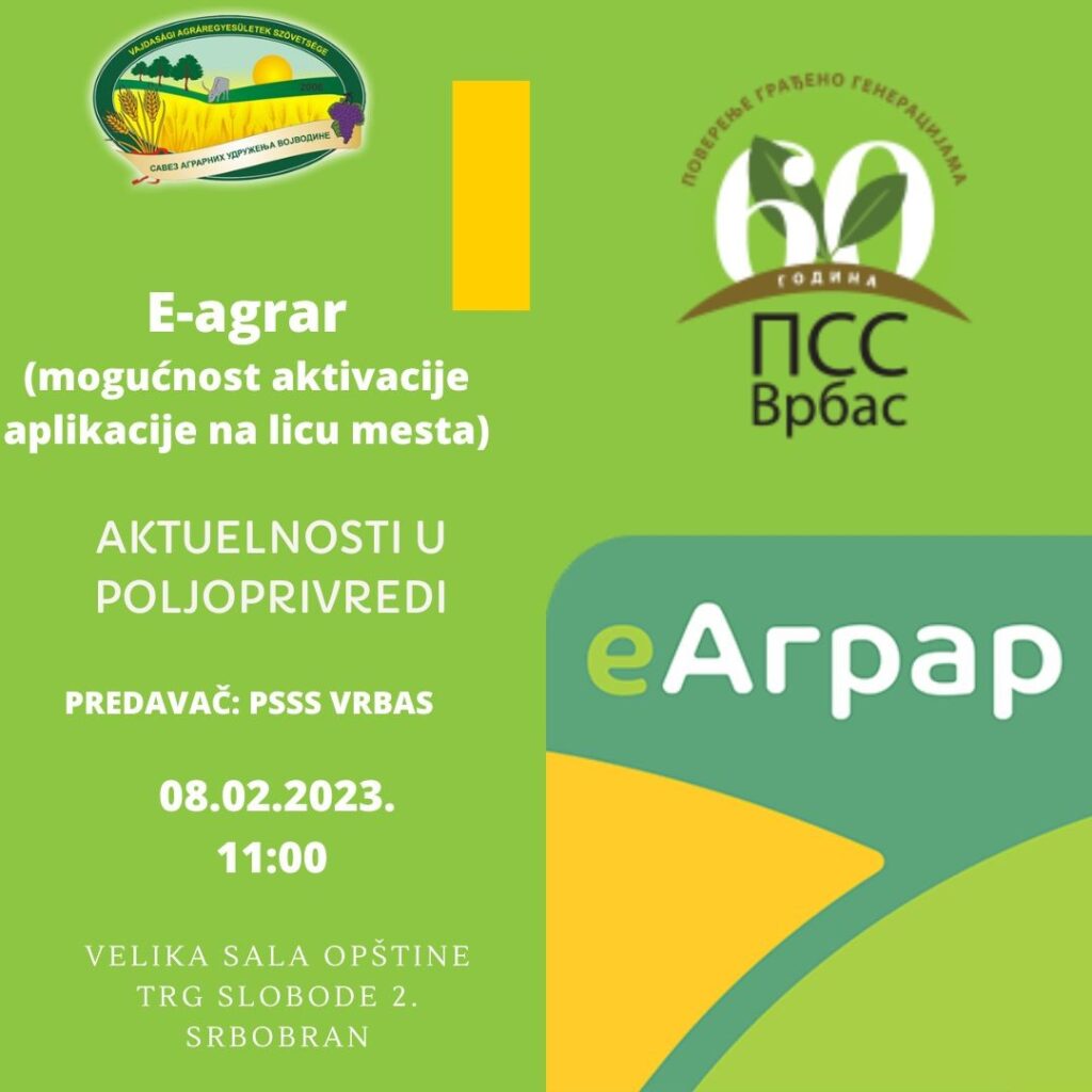 Elektronska aplikacija za poljoprivredna gazdinastva eAgrar putem koje će se vršiti registracija i isplata subvencija, biće u funkciji do sredine marta. Tim povodom ,Poljoprivredna stručna i savetodavna služba iz Vrbasa, u velikoj Sali SO Srbobran, 8. februara, sa početkom u 11.00 časova, organizuje sastanak sa poljoprivrednicima kako bi se razjasnile sve nedoumice u vezi primene eAgrar-a.